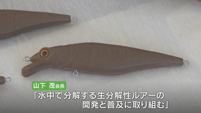 式典で山下茂会長は環境保全の一環として、サトウキビやトウモロコシを材料に製造し、水中で分解する生分解性ルアーの開発と普及に取り組んでいくと表明しました。