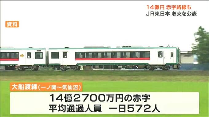 JR東日本によりますと、県内に関係する昨年度の赤字路線は、一ノ関駅と気仙沼駅を結ぶ「大船渡線」が14億2700万円の赤字となりました。平均通過人員は1日572人でした。