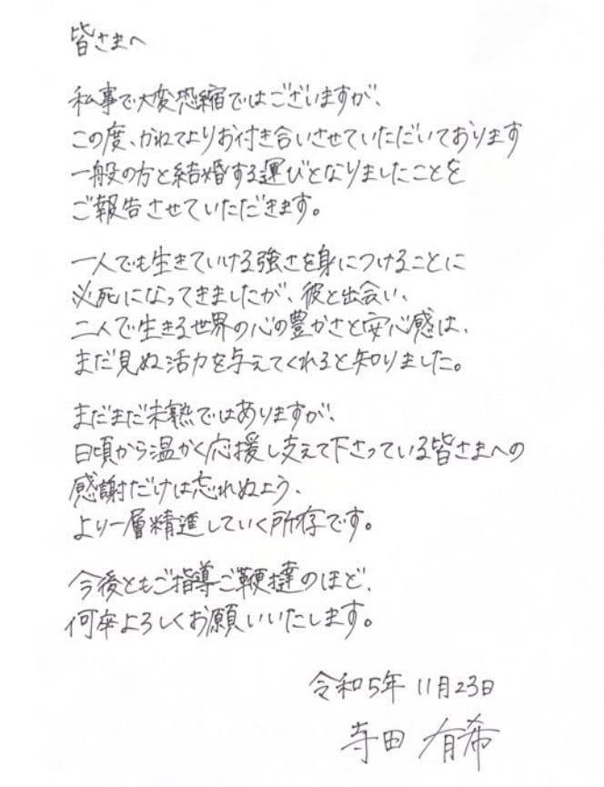 寺田さんは自筆の文書をアップし「皆さまへ 私事で大変恐縮ではございますが、