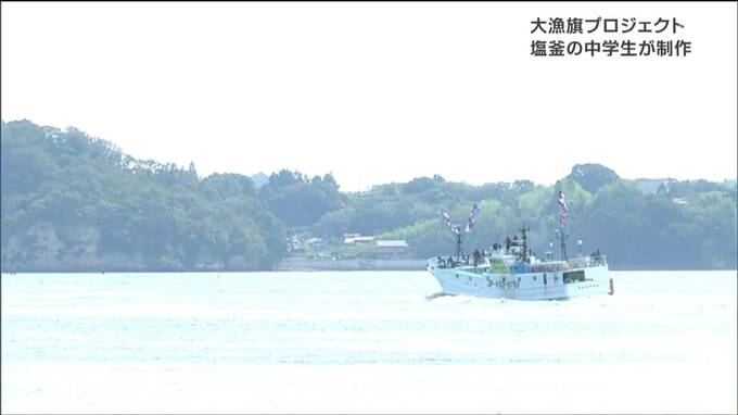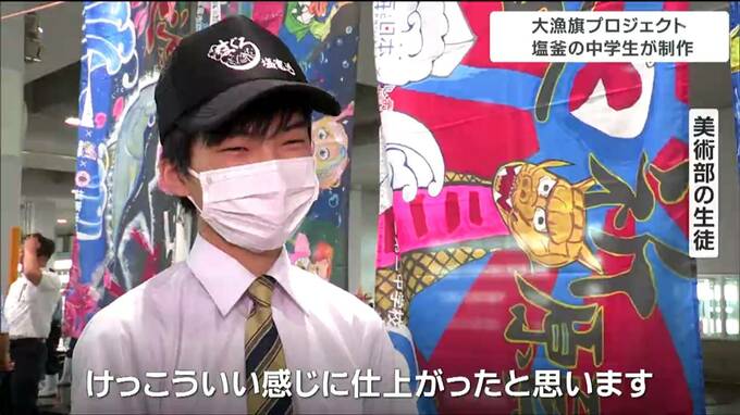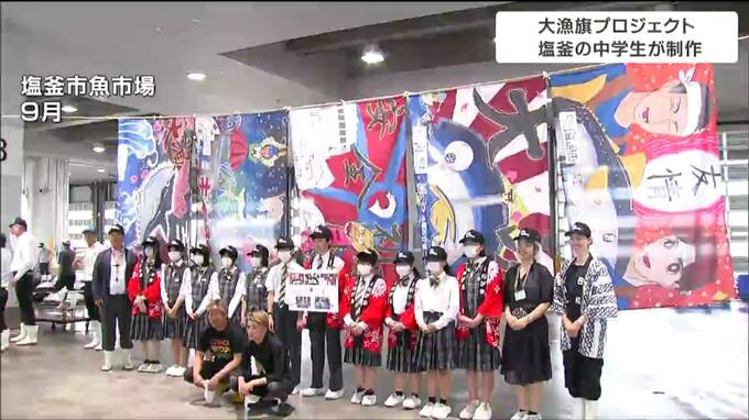 マグロが大きく描かれたデザインや笑顔の漁師をモチーフにしたデザインなど生徒の思いとアイデアが詰まった5枚の大漁旗が完成しました。