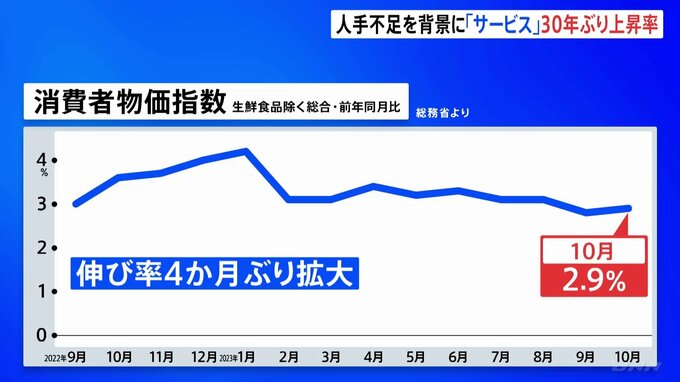 10月の全国の消費者物価指数は1年前より2.9%上昇し、伸び率は4か月ぶりに拡大しました。人手不足を背景に“値上がり”の主役は「モノ」の価格から「サービス」の価格へ移りつつあります。10月の消費者物価指数は1…