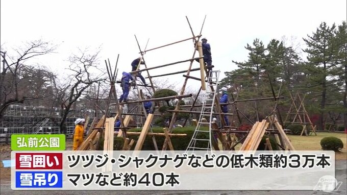 これからの冬本番に向けて青森県弘前市の弘前公園では園内の木々を雪の重さから守る「雪囲い」の作業が進められています。弘前公園では毎年、ツツジやシャクナゲなどの主に丈の低い木、約3万本に雪囲いを施してい…