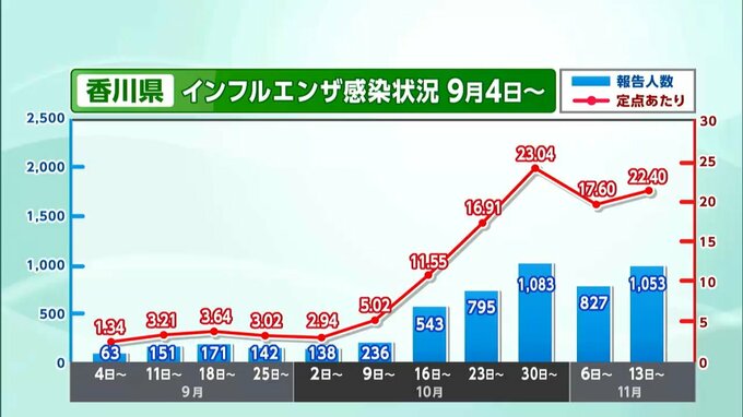 一方、県内47の医療機関で定点把握をしている香川県でも、1医療機関あたりの患者数は、22.40人と増加しています。