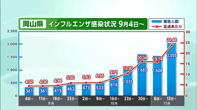 岡山県では、県内84の医療機関で定点把握をしています。今月13日から19日までの1医療機関あたりの患者数は24.46人と、増加傾向が続いています。