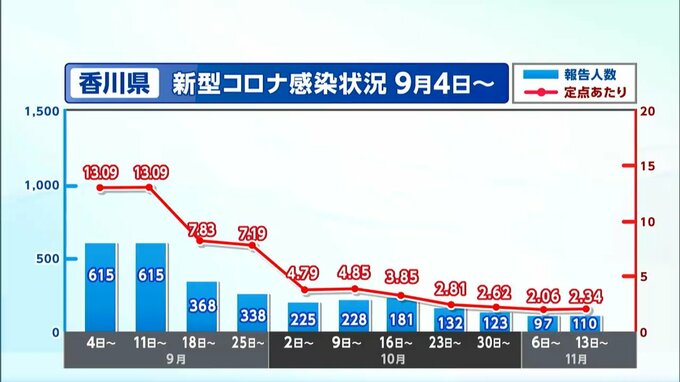香川県では、減少傾向が続いていたものの、今月(11月)13日から19日までの1つの医療機関あたりの患者者数が、2.34人となるなど増加傾向です。