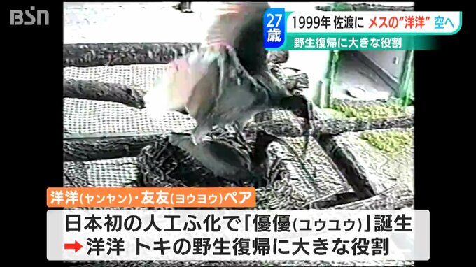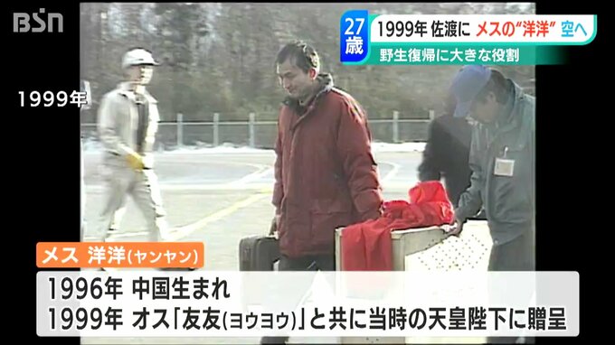 1996年に中国で生まれたメスの「洋洋(ヤンヤン)」は1999年にオスの「友友(ヨウヨウ)」とともに当時の天皇陛下に贈呈され、佐渡トキ保護センターで飼育されていました。