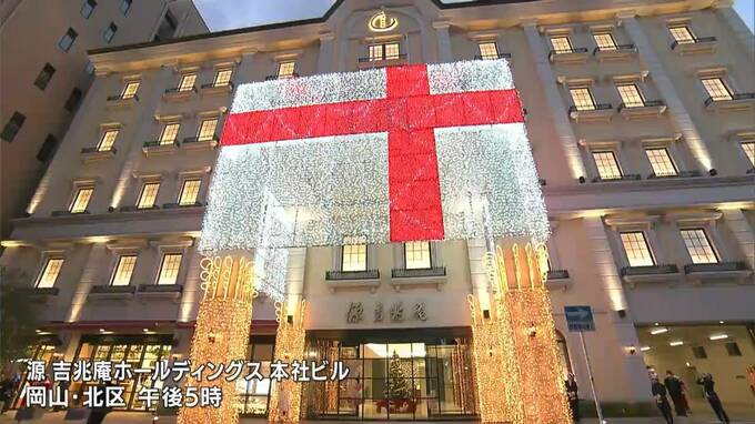 クリスマスまであと1か月です。街に彩りを添えようと岡山市北区の源吉兆庵ホールディングスの本社ビルの前に恒例のイルミネーションが設置されました。