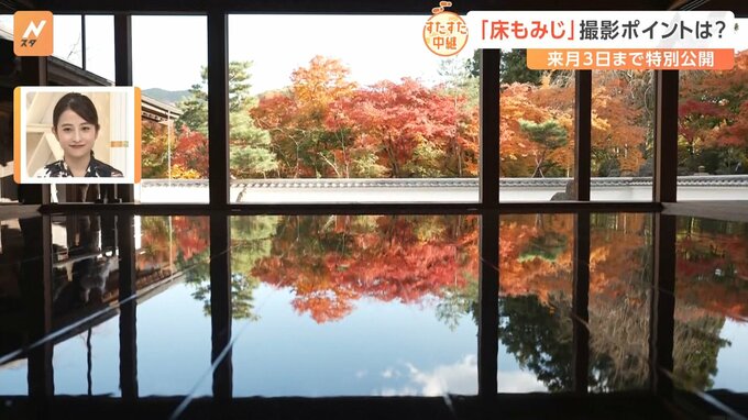 「歩いて発見!すたすた中継」。床に映るもみじ「床もみじ」が特別公開されている寺に、齋藤慎太郎アナウンサーが行っています。