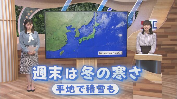 坂下悠乃気象予報士)今日の長野県内はお昼頃までに最高気温15度前後を観測しまして、北風とともに午後はどんどんと気温が下がってきています。この時間(24日午後6時40分ごろ)は朝よりも冷えてきているところが出てきているようです。そして週末はさらに冷えていきます。ポイントはこちらです。