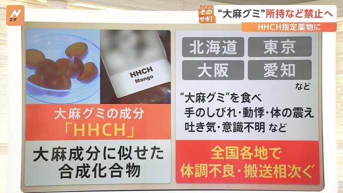 大麻成分に似せた合成化合物「HHCH」が入った“大麻グミ”などの商品が問題になっています。北海道、東京、大阪、愛知などで“大麻グミ”を食べ、手のしびれ・動悸・体の震え・吐き気・意識不明など、全国各地で体調不良・搬送が相次いで発生する事態となっています。