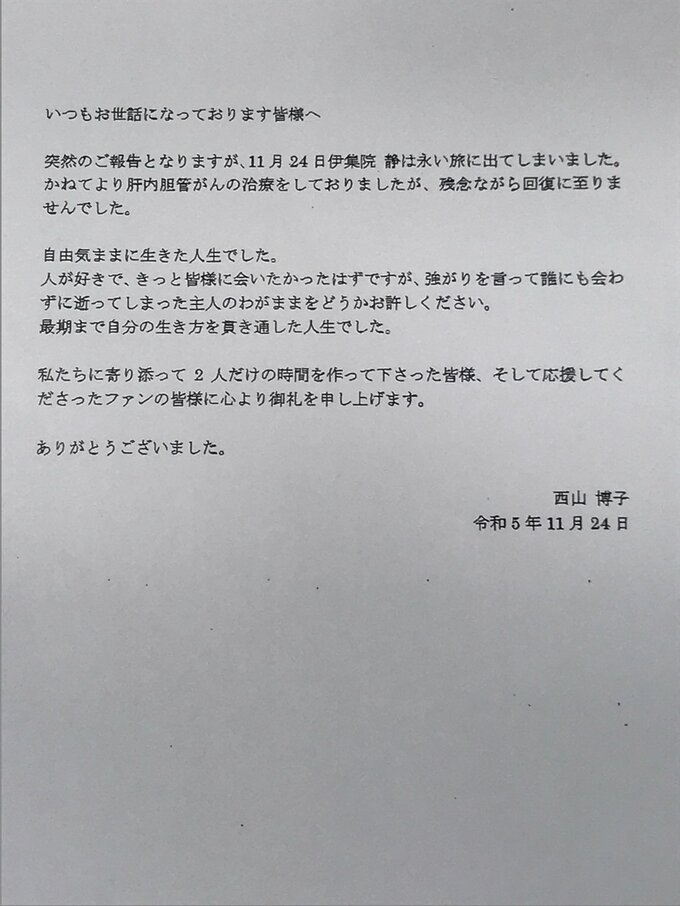 伊集院さんは「今年10月に肝内胆管癌との診断を受けました。執筆作業を休止させていただきます」と自身のホームページで公表していました。