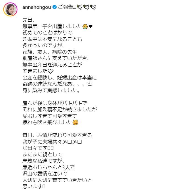 本郷さんは「先日、無事第一子を出産しました」と報告。周囲への感謝とともに「出産を経験し、妊娠出産は本当に奇跡の連続なんだなあ、、、と身に染みて実感しました。」と心情を明かしています。