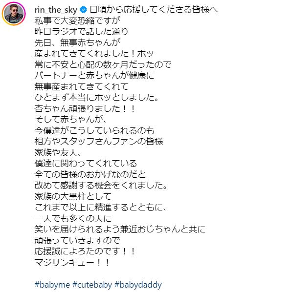 夫のりんたろー。(EXIT)さんも同じく自身のインスタグラムを更新し「パートナーと赤ちゃんが健康に無事産まれてきてくれてひとまず本当にホッとしました。」と安堵の気持ちを表現し「杏ちゃん頑張りました!!」と妻への賛辞を綴っています。