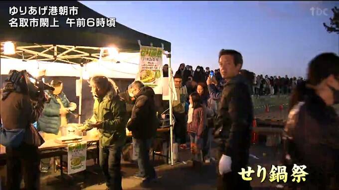 名取市の「ゆりあげ港朝市」で、地元特産のセリを使った鍋を振る舞う「せり鍋祭」が26日開かれ大勢の人で賑わいました。