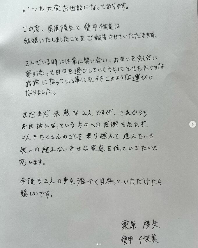 2人は連名で直筆の文書をアップし「この度、栗原陵矢と愛甲千笑美は結婚いたしましたことをご報告させていただきます。」と報告。
