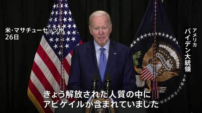 アメリカのバイデン大統領はイスラム組織ハマスからアメリカ国籍の4歳の女の子が解放されたことを受けて会見し、人質のさらなる解放に向けて、戦闘の一時停止の延長を働きかけていることを明らかにしました。アメ…