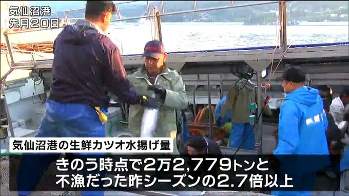 気仙沼漁協によりますと、気仙沼港では今シーズンの生鮮カツオの水揚げがほぼ終了し、水揚げ量は、26日時点で2万2779トンとなりました。不漁だった昨シーズンの2.7倍以上です。