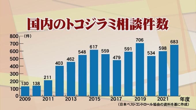 しかし、ここ10年ほどで殺虫成分に耐性をもった強力な「トコジラミ」が出現。全国の相談件数も2009年と比べると5倍以上に増加しています。