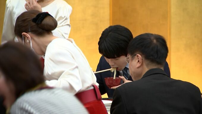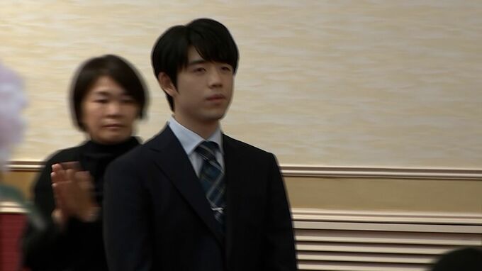 対局の会場となる予定だった琴平町の旅館琴参閣に、スーツ姿で現れた藤井聡太竜王です。将棋ファンらのために行われた、祝賀会です。