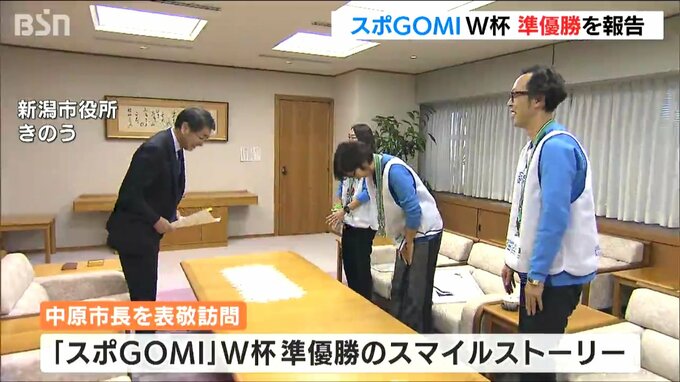 拾ったごみの量などをスポーツ感覚で競う「スポGOMI(ごみ)」の世界大会で準優勝に輝いた新潟市のチームが27日、中原市長を表敬訪問しました。