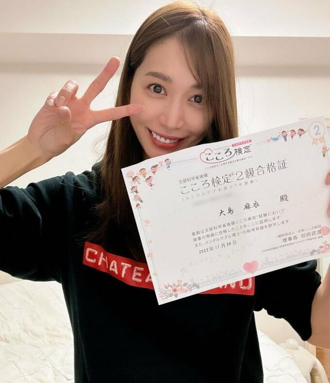 大島さんは「この度、文部科学省後援 こころ検定2級に合格しましたぁぁ 以前からメンタルケアや心理学にとても興味があり、実はコツコツと資格のお勉強をしていたのですが、この度無事に合格することができました!!」と、投稿。