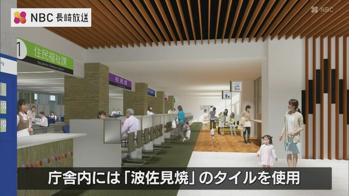 鉄筋コンクリート3階建て、延べ床面積は3300平方メートルで、庁舎内には波佐見焼のタイルを使い、町の特徴をアピールするほか、町民の待合スペースを広げゆとりを持たせるなど、町民サービスの向上を図ったということです。