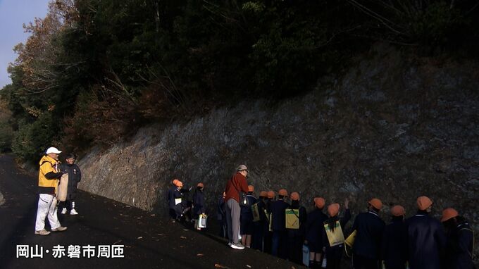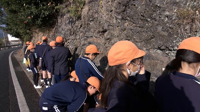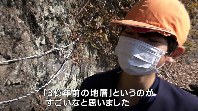 3億年前の貴重な地層の存在を子どもたちに知ってもらい、ふるさとを誇りに思ってもらいたいと、授業の一環で行われたフィールドワークです。
