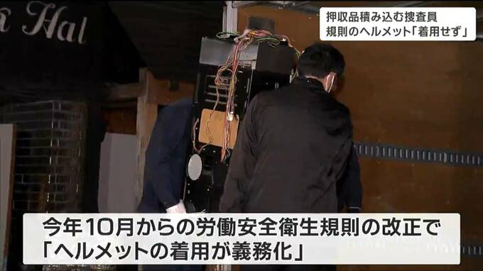 ところで、家宅捜索で押収品をトラックに積み込むの映像で、ヘルメットを着用していない捜査員の姿が映っていました。しかし、最大積載量2トン以上5トン未満のトラックで、テールゲートリフターを使って荷物の積み下ろしする場合には、今年10月の労働安全衛生規則の改正により、ヘルメットの着用が義務となっています。したがって、今回の捜査員の行為は、ヘルメット着用義務違反となります。これについて、県警は「法改正を知らなかった」と説明していて、「法改正の周知や指導を徹底していく」とコメントしています。