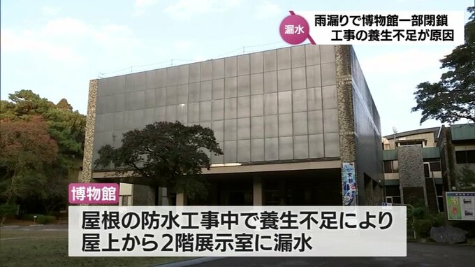 博物館で雨漏りというニュースです。宮崎市の宮崎県総合博物館は、屋上からの漏水の影響で、一部の展示室を当面の間、閉鎖すると発表しました。(三浦功将記者)「さらなる漏水に備えて、展示室の資料には、すべて…