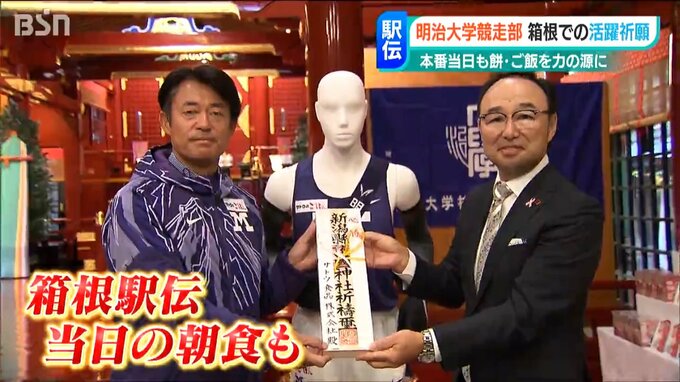 1月に行われる「第100回東京箱根間往復大学駅伝競走(箱根駅伝)」にエントリーする明治大学競走部の“ユニホームスポンサー”を務める『サトウ食品』が、新潟市でチームの活躍を祈願しました。【記者リポート】「駅…