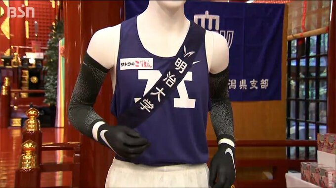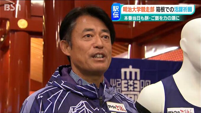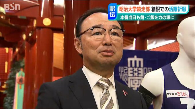 箱根駅伝での明治大学競走部の活躍を祈願したのは、佐藤元社長らサトウ食品の関係者です。サトウ食品は2020年に明治大学競走部とユニホームスポンサー契約を結び、今年はご飯とお餅とを合わせて3万3000食分を提供してチームをサポート。