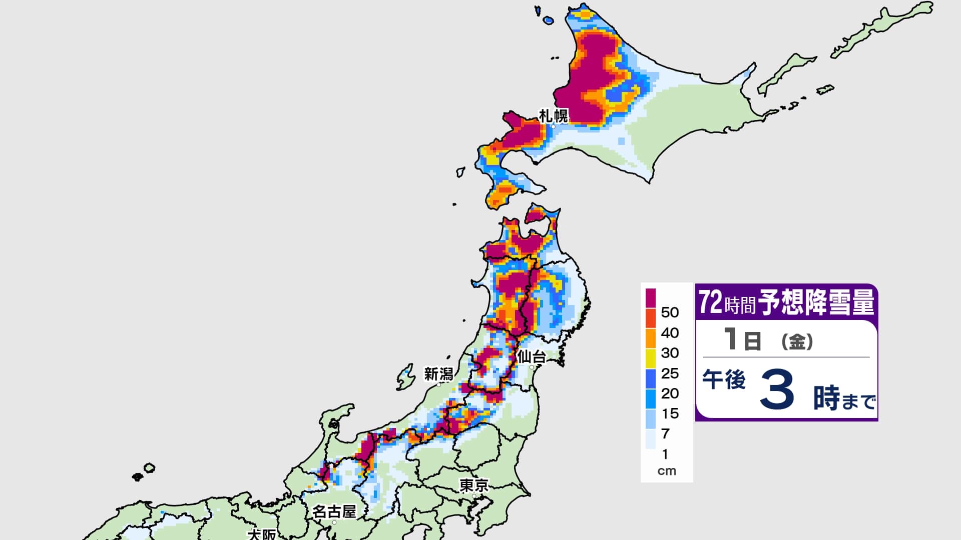 「週後半は冬本番の寒さ」 北日本は暴風雪に警戒…平地で雪を降らせるほどの寒気…北海道、東北だけでなく中国地方にも【寒気・大雪・風のシミュレーション~12月1日】 南日本放送 2023年11月29日(水) 10:17 国内 ■48時間の予想積雪量 ~1日(金) 降雪量が1m近くに達する可能性があります。今後の情報に注意しましょう。