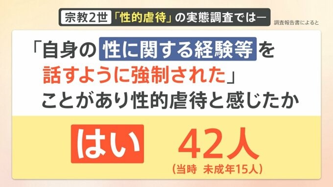 調査報告書によると、この実態調査では、「自身の性に関する経験等を話すように強制された」ことがあり、性的虐待と感じたか、という内容に対して、▼42人が「はい」と答えています。そのうち、当時、未成年だったのは15人ということでした。