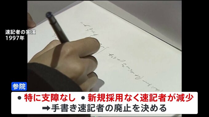 参議院は、本会議場での発言などを手書きで記録する速記者の廃止を決めました。参議院の議院運営委員会の理事会はきのう、速記者が本会議場などに入場し、手書きで発言を記録することを廃止すると決めました。参議…
