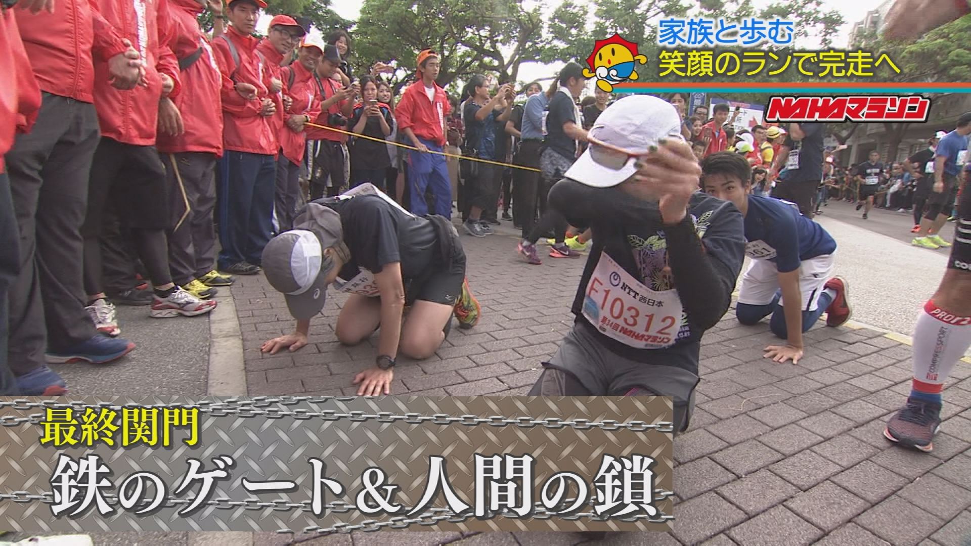 NAHAマラソン名物、ゴール手前の最後の関門となる「鉄のゲート」と「人間の鎖」。制限時間である6時間15分以内にここを通過できなければ「完走」とはならず、毎年ゲート越しに明暗がくっきりと分かれます。