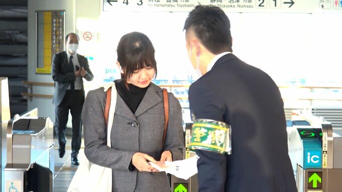 JR天竜川駅の改札前では、浜松東警察署の署員14人が通勤や通学する人たちに情報提供を呼び掛けました。