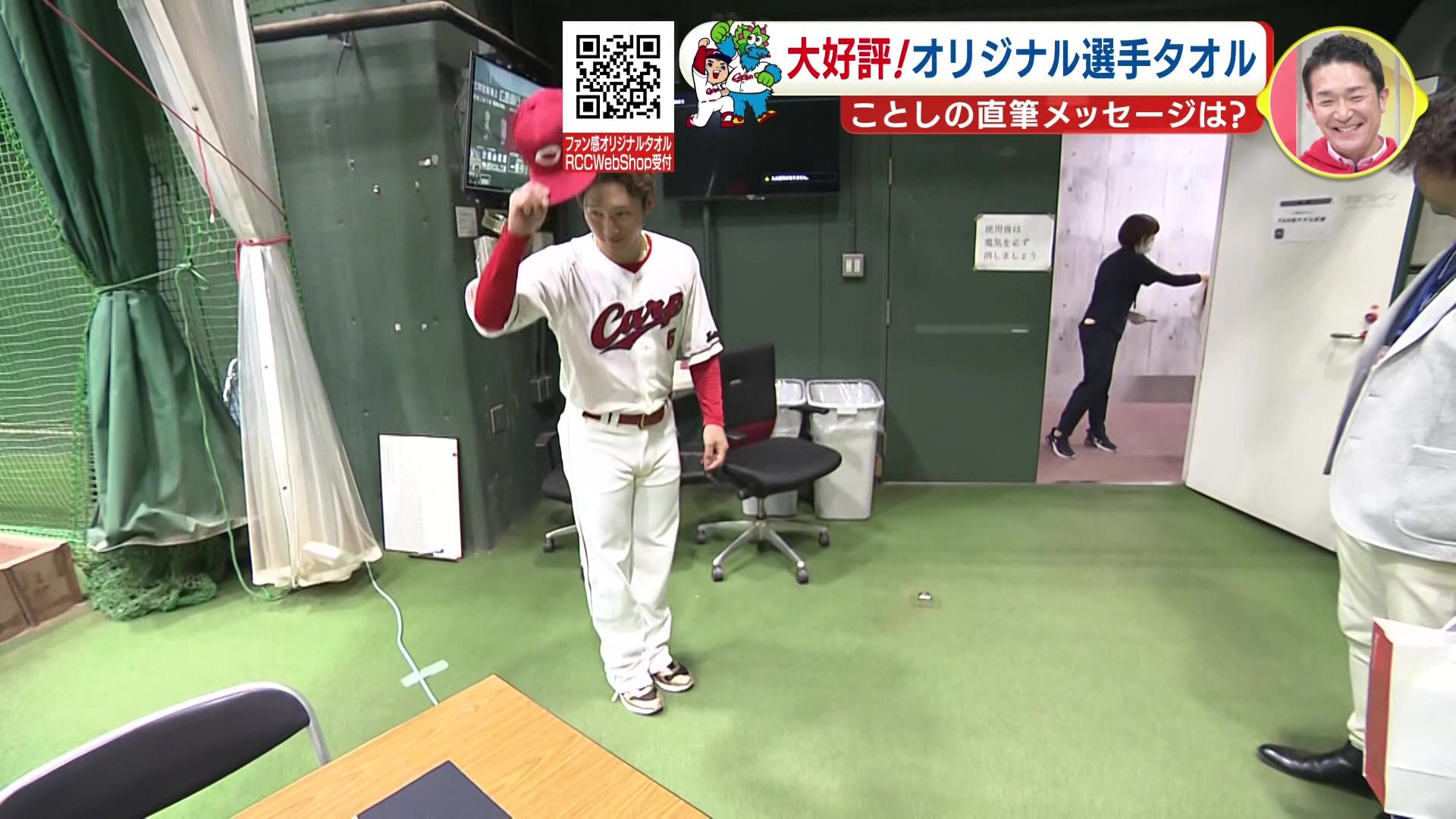山崎さん、おもしろい企画でしょ。例えば、こういうデザインのタオルに 新井貴浩 監督なら空いているスペースに「ファンは家族」というメッセージが入ります。上本選手だったら守備のときに「ボール飛んでくるな」っていうタオルを出して応援する…