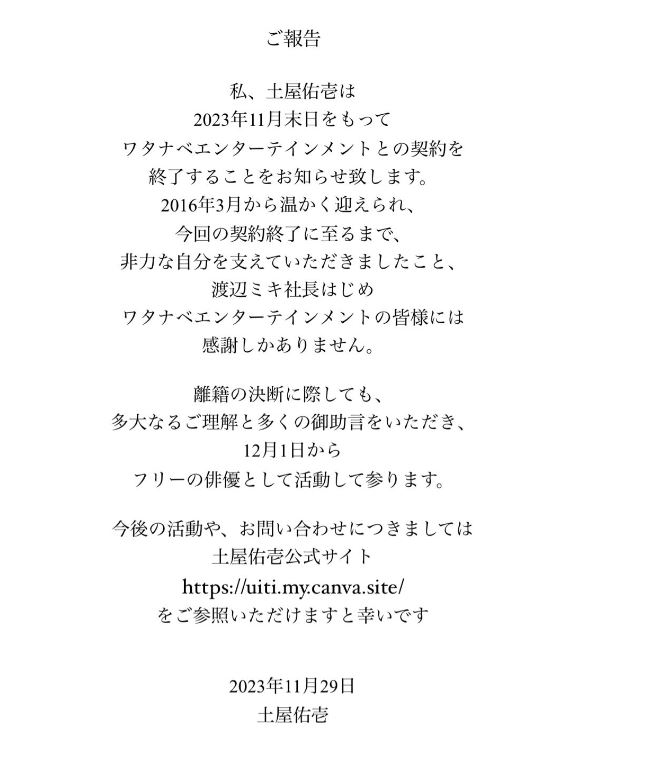 土屋さんは「私、土屋佑壱は2023年11月末日をもって、ワタナベエンターテインメントとの契約を終了することをお知らせ致します。」と書き出しています。「2016年3月から温かく迎えられ、今回の契約終了に至るまで、非力な自分を支えていただきましたこと、」と振り返り、「渡辺ミキ社長はじめワタナベエンターテインメントの皆様には感謝しかありません。」と感謝の言葉を綴っています。