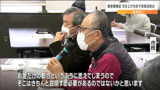 市営バスや地下鉄を安く利用できる敬老乗車証について、仙台市は自己負担の割合を引き上げる方針を固めています。この方針を周知する市民説明会が29日から始まり、利用者の実態が反映されていないなどの意見が出されました。