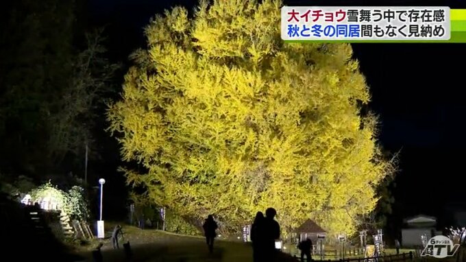 青森県深浦町では秋と冬が同居する景色が広がっています。小雪が舞う中、鮮やかな黄色い葉をたたえた北金ヶ沢の「日本一の大イチョウ」です。幹回り22メートル、高さ約31メートルの国の天然記念物で、黄葉スポット…