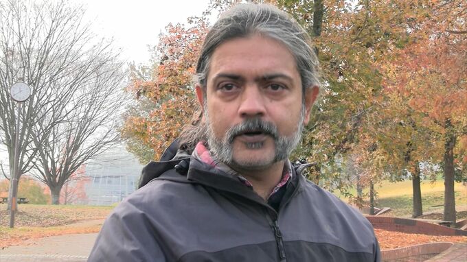 インド人のアーティストアシム・ワキフさんです。竹を素材とした大型の作品を制作する予定で、作品が設置される候補地のひとつとなっている津山市の公園を視察しました。