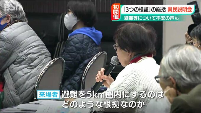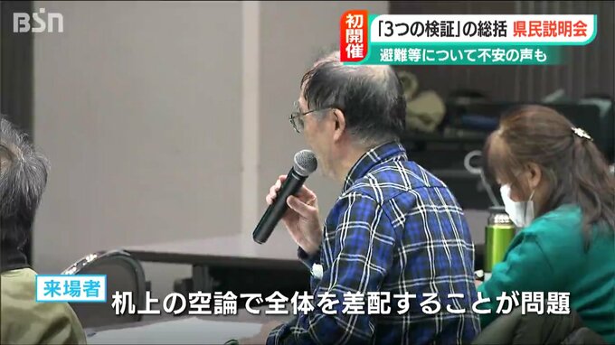 【来場者は】「避難するとき5キロ以内の人は避難して、5キロから30キロの人は自宅で待っているという話なんですね。本当に事故に遭った時の住民の感情に合っているのか。命をうしなうかどうかのときにに自宅に待機しろという机上の空論で全体を差配することが問題」