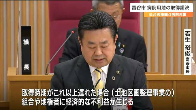 宮城県が進める仙台医療圏4病院の再編構想を巡る動きです。富谷市は、東北労災病院と県立精神医療センターの移転候補地の取得を30日の市議会に諮り可決しました。県と病院の基本合意に先行し、市が用地を確保するのは異例です。