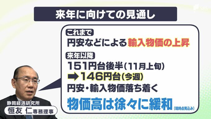 静岡経済研究所の恒友仁専務理事によりますと、これまでの物価高は円安による輸入物価の上昇が主な原因でした。しかし、11月上旬は1ドル=151円台後半でしたが、今週に入り、146円台となり、円安が落ち着いてきました。よって、2024年以降は物価高は徐々に緩和する見込みとしています。長引く物価高への辛抱は、もう少し続きそうです。