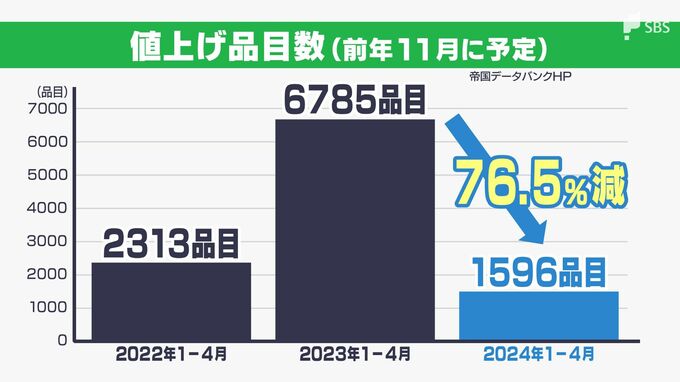 帝国データバンクによると、現時点で2024年1月から4月に予想される値上げの品目数は1596品目と、2023年の6785品目に比べ、76.5%も減る見込みです。