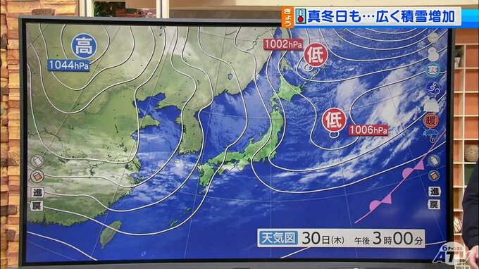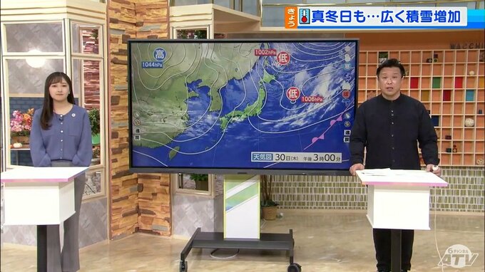 気圧配置を見てみますと西高東低の冬型の気圧配置。強い寒気の流れ込みのピークは過ぎましたけども筋状の雲がまだ大きく広がっています。明日は12月のスタートですが局地的な大雪の恐れがあります。
