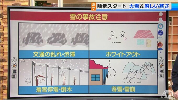 12月1日も交通の乱れ、渋滞、大渋滞があるかもしれませんので、時間に余裕をもって、交通情報もしっかり確認して下さい。ホワイトアウトにも注意です。湿った雪による着雪の停電・倒木の恐れもあります。積雪の多いところでは、なだれ、屋根からの落雪、あとは雪片付けの事故など、くれぐれもご注意ください。