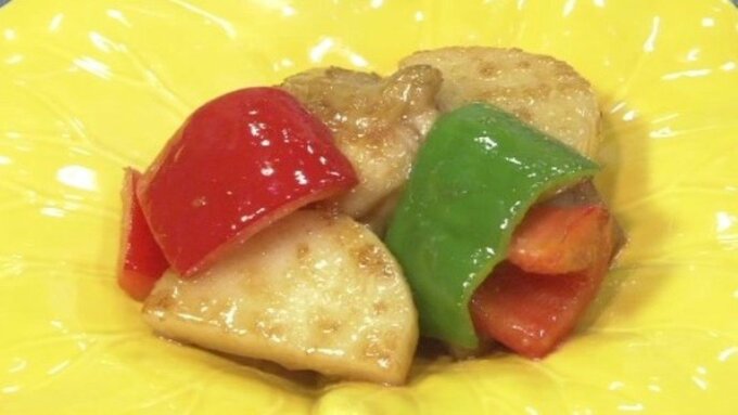 4.同じフライパンに長芋を入れ両面を焼く。焼き色がついたらピーマンとパプリカを入れ軽く焼いて、一旦取り出す。
