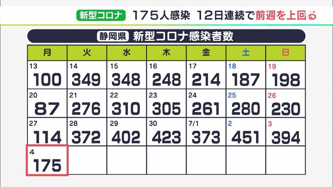 7月4日、静岡県内で新たに175人が新型コロナウイルスに感染したことがわかりました。新たな感染者を自治体別にみますと、浜松市で47人、静岡市で35人、沼津市で14人、下田市と藤枝市で13人などとなっています。死…