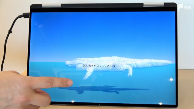 また、タブレット画面に映るワニに触れると、ワニが反応するというデジタル作品も展示されています。